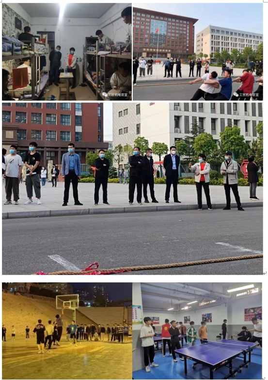 疫情防控期间,我院领导和学管老师按照学校要求与学生同吃同住,组成防控小组坚守岗位,我院领导深入宿舍送关怀,了解学生心理动态,落实疫情防控网格化管理,为缓解封闭管理期间学生的焦躁情绪,充实学生课余生活,提升学生思想高度,在符合疫情防控要求下,积极组织学生开展拔河比赛,篮球赛,乒乓球赛,羽毛球赛,趣味运动会,文明宿舍评比等文体活动20余场,充实学生在校生活,调动学生的热情。