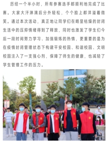 通过一些列丰富多彩的文体活动,不仅调动了学生的积极热情,还充实了封控期间在校大学生的生活,进一步促进学生身心健康发展。