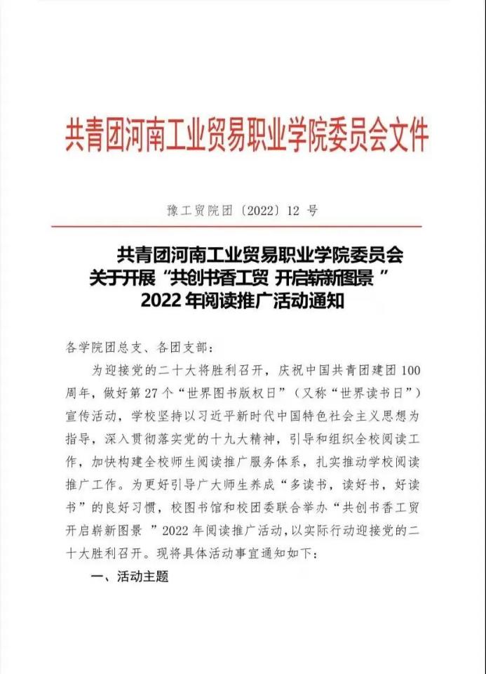 为认真贯彻落实党的十九大关于开展全民阅读活动的重大部署,迎接党的二十大召开;在校党委委员、副校长刘卫红安排部署下,校团委联合图书馆积极开展了“共创书香工贸 开启崭新图景 ”2022年阅读推广活动,努力在全校形成“多读书、读好书”的优良风尚。