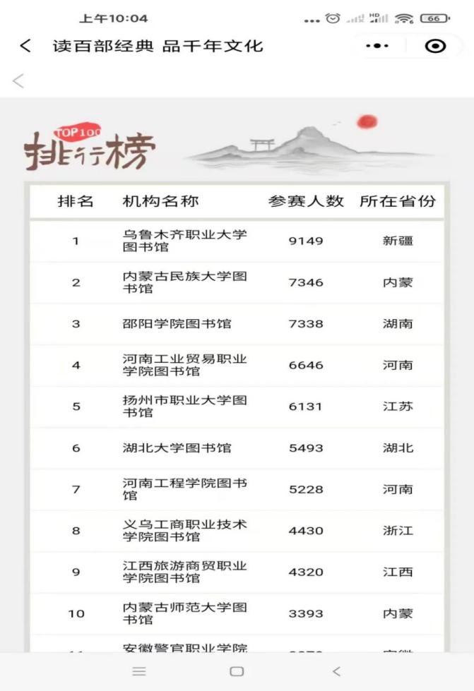 本次活动由“共享悦读”微书评荐书、“阅读之星”评选、《百部经典》阅读打卡、“经典有声”原著诵读展示、“百部经典·百题大闯关”传统文化知识竞赛、朗读者六部分组成。其中由国家图书馆、中国图书馆学会举办的“读百部经典品千年文化”——《中华传统文化百部经典》校园行活动,同学们积极参加,坚持每天阅读打卡,读原著,参与传统文化知识竞赛,截至目前我校参加活动人数共6646人,在全国排名第四,河南省排名第一