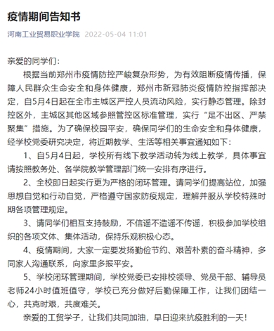 工贸防疫进行时 ‖ “疫”路同行,我们在一起——河南工业贸易职业学院抗疫纪实