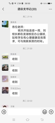 刘合行带领校党委班子成员坐镇南、北两个校区,与学生同吃、同住,共同封闭,扛牢疫情防控责任。180名教职员工,迅速集结,连夜到岗,与学生守在一起。各学院领导带队深入学生宿舍,走访慰问学生,详细了解学生的学习、生活情况,核酸检测情况,叮嘱同学们做好个人防护,并对学生宿舍的疫情防控措施进行了细致的检查,确保疫情防控到位。全体辅导员下沉一线,到学生身边,做好学生的思想引导、心理疏导和疫情防控各项政策的解释说明,督促学生不聚集、不串门,严格配合公寓管理。校心理健康教育中心第一时间通过校园广播、微信公众号发布心理咨询方式,校党委委员、副校长刘卫红利用自己的专业特长,亲自为学生做心理疏导,有效地缓解了学生在校园封闭期间的紧张、焦虑情绪,营造出积极健康的校园心理氛围。
